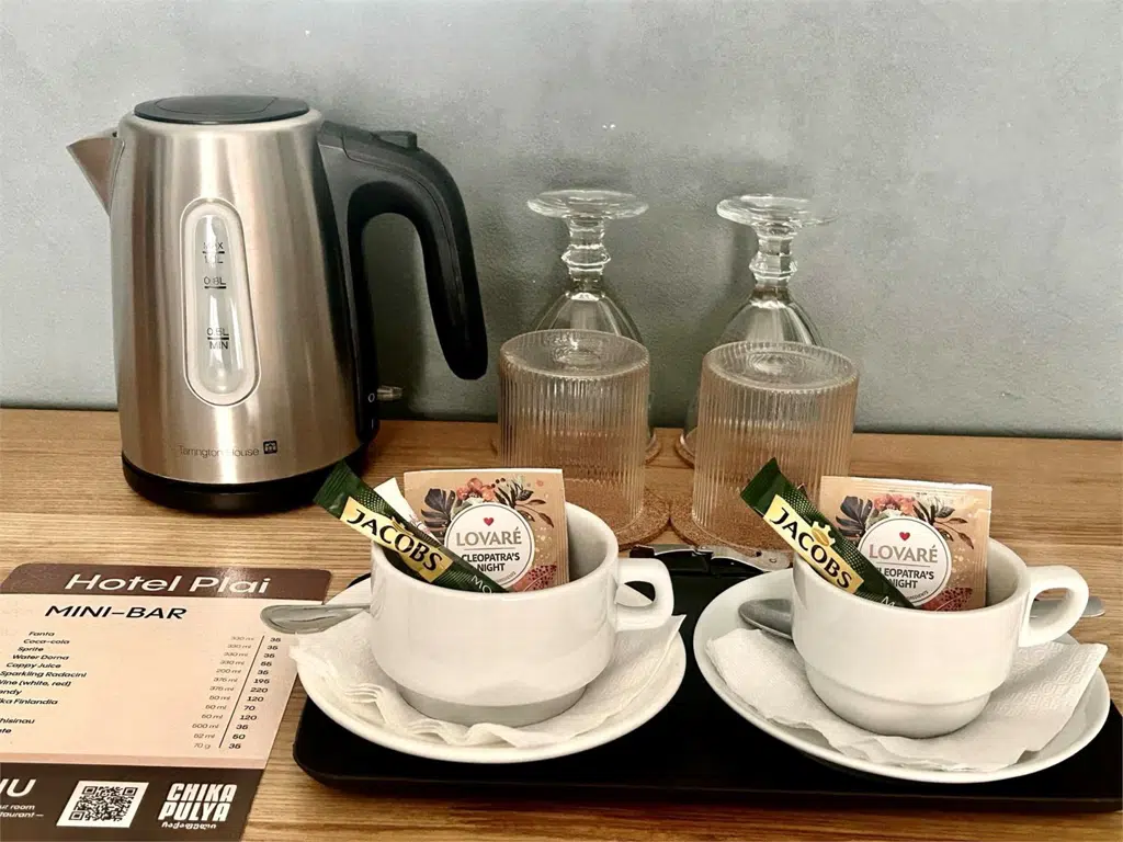 Tea set is available in each room. It includes: tea, coffee, sugar, kettle, cups.